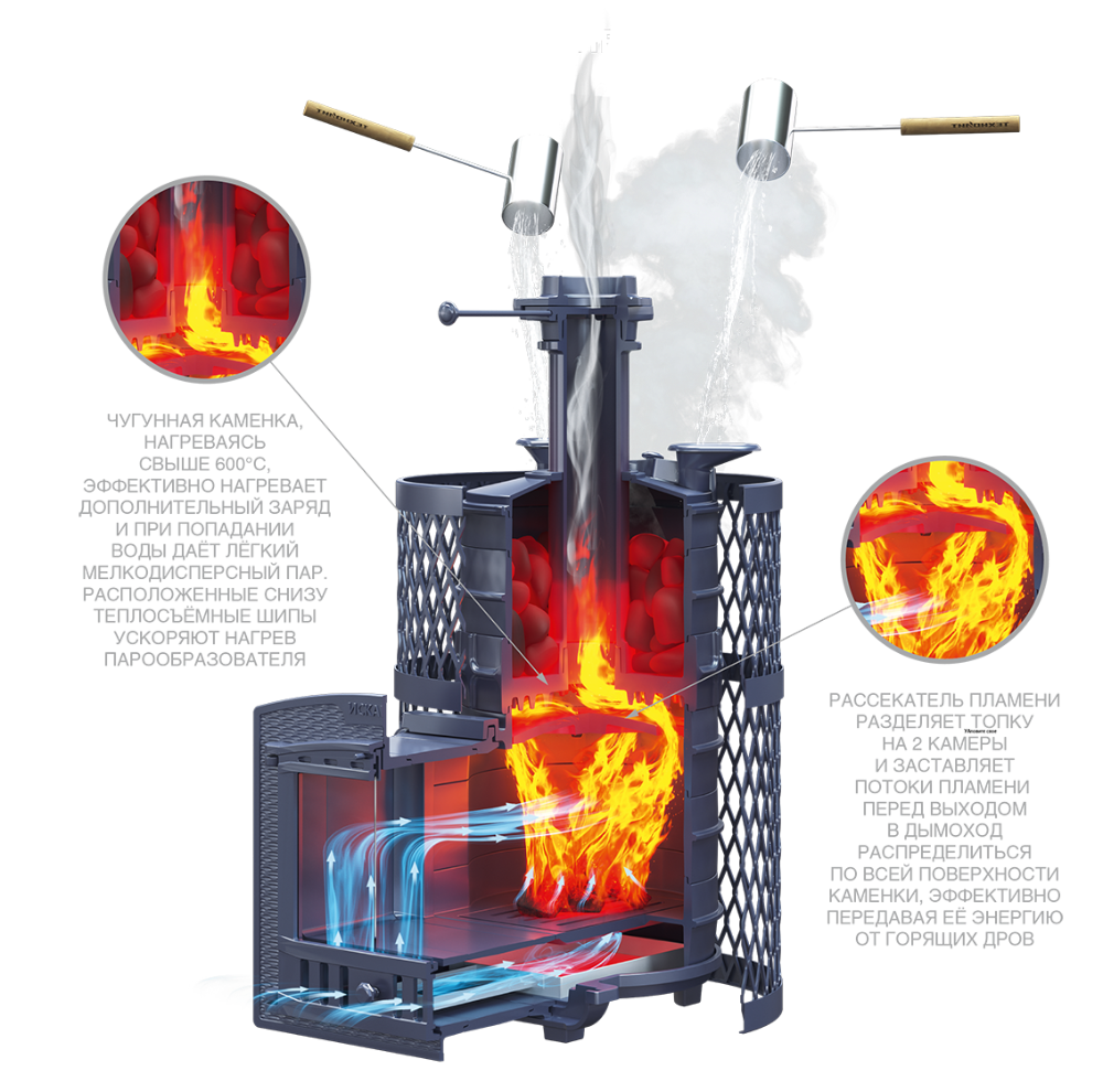 Чугунная банная печь с прямым нагревом парообразователя. Печь со стенками толщиной 16 миллиметров быстро нагревает воздух в парной и производит качественный мелкодисперсный пар за счёт теплоёмкой каменки, оснащённой теплосъёмными шипами на нижней поверхности.