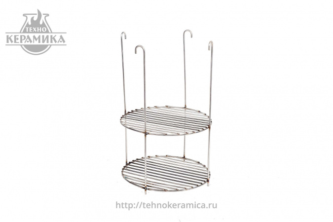 Этажерка двух ярусная диаметром 220 мм является отличной альтернативой шампурам и позволяет готовить разнообразные блюда. Она подходит для средних тандыров, таких как тандыр "Аполлон". Готовить с её помощью очень легко и удобно. На ней отлично запекаются овощи, стейки рыбы и мяса, а также тушки птицы. За счет жара от глиняных стенок тандыра, пища получается вкусной, не пригорает, равномерно обжаривается со всех сторон. Используя двух ярусную этажерку можно готовить и запекать блюда в собственном соку, предварительно завернув их в фольгу. Расстояние между ярусами в четырнадцать сантиметров позволяет беспрерывно циркулировать горячему воздуху и равномерно запекать пищу между слоями. А также готовить более объемные блюда и накормить сразу всю семью.