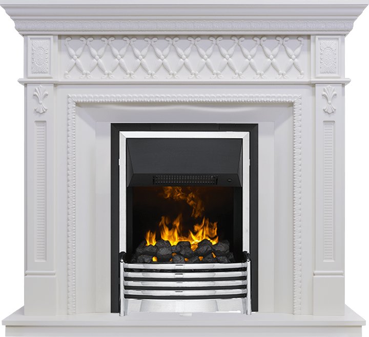 Зона очага изысканно обрамлена витым орнаментом, импосты и колонны, расположенные по бокам портала, не имеют яркой выраженности и обозначены лишь легким классическим барельефом.