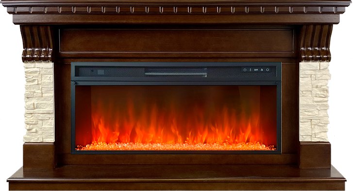 В качестве внутреннего декора используются стильные прозрачные кристаллы и разноцветная галька. Подсветку кристаллов и яркость пламени можно регулировать – доступно 4 возможных варианта. Модель дополнена звуковой имитацией потрескивания дров.