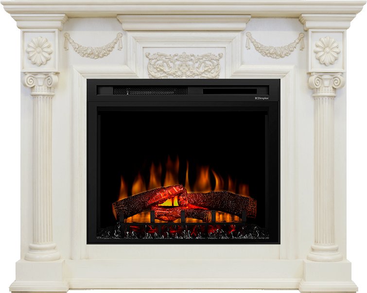 Обрамление для камина сделано из высококачественных материалов. Резной декор украшает фронтальную поверхность портала, а зона очага обрамляется изящными колоннами.