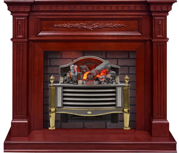 Сам очаг отличается изяществом дизайна - точеные позолоченные ножки поддерживают колосник насыщенного черного цвета, в котором расположены поленья со встроенными светодиодами, что делает их неотличимыми от натурального тлеющего в костре дерева. На задней стенке очага размещены фигурные флористические элементы, которые гармонично сочетаются с общим стилевым решением камина.