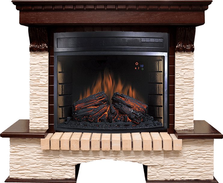 Модель представлена в нескольких вариантах, различающихся как по принципу установки (угловой или пристенный), так и цветовым решением облицовочного камня и деревянных элементов. Декорирована резными вставками в античном стиле.