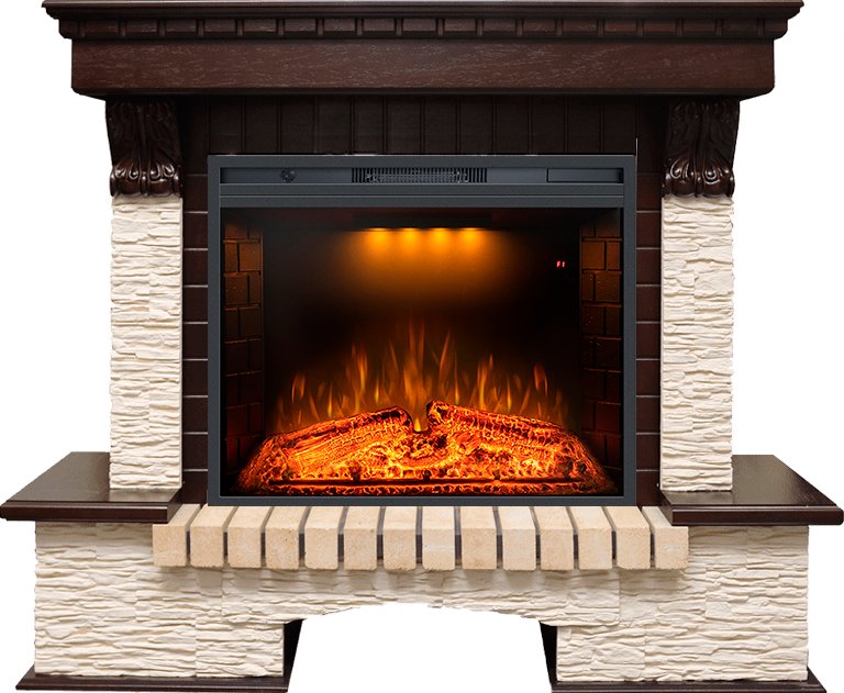 Модель представлена в нескольких вариантах, различающихся как по принципу установки (угловой или пристенный), так и цветовым решением облицовочного камня и деревянных элементов. Декорирована резными вставками в античном стиле.