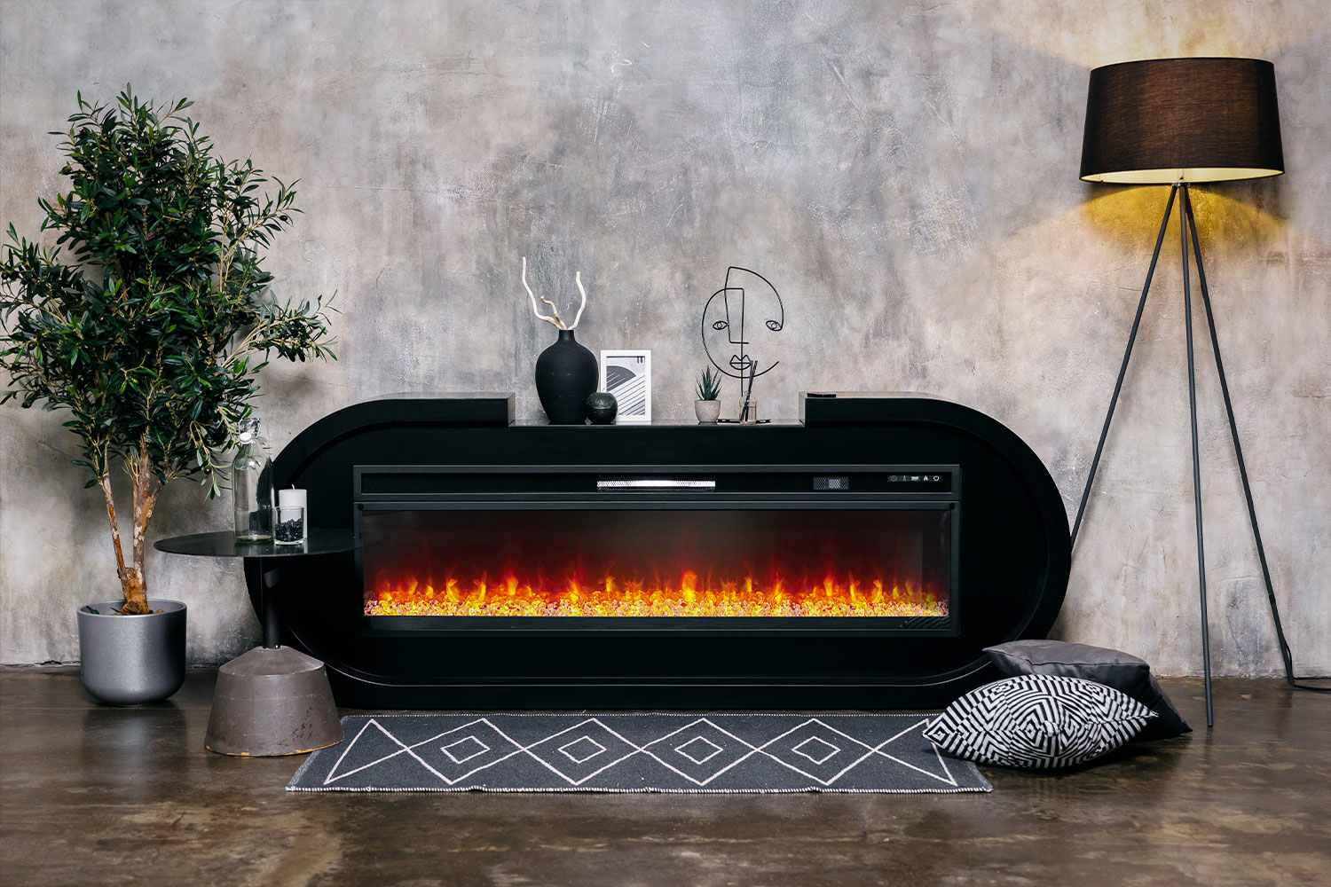Огонь в топке исходит не от привычных дров, а от прозрачных кристаллов или цветной гальки. Это добавляет ему элегантности и утонченности. Такой декоративный элемент сделает любое помещение более современным и стильным.