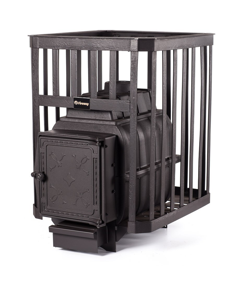 Печь предназначена для отопления парильных помещений 10-18 куб. м. Топка печи чугунная. Каменка в виде сетки из кованной стали. Топливный канал без выноса для топки печи из парильного помещения. Топочная дверца чугунная стандартная К211 Fireway, размер 290х297 mm. Загрузка дров фронтальная. Диаметр дымохода 115 мм. Расположение дымохода сверху. Отделка антрацит. Гарантия 3 года.