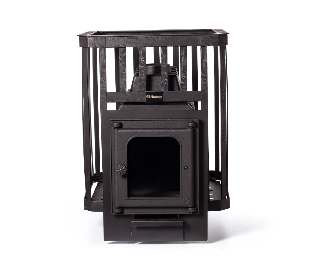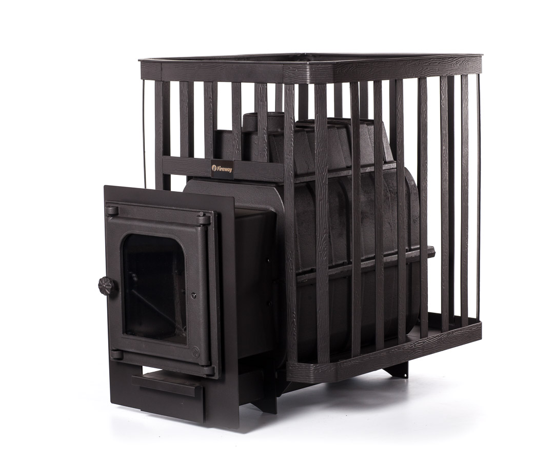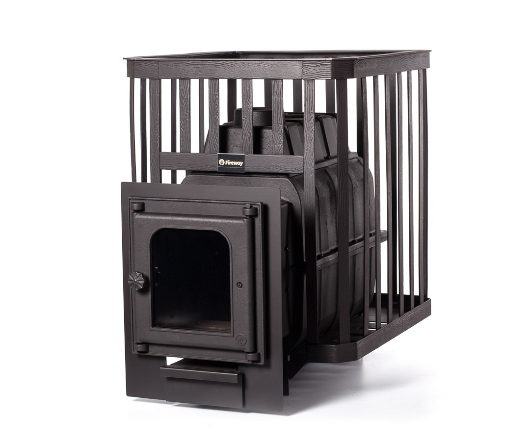 Печь предназначена для отопления парильных помещений 14-24 куб. м. Топка печи чугунная. Каменка в виде сетки из кованной стали. Выносной канал 20 см для топки печи из смежного помещения. Топочная дверца чугунная стандартная К201 Fireway, размер 290х297 mm. Загрузка дров фронтальная. Диаметр дымохода 115 мм. Расположение дымохода сверху. Отделка антрацит. Размер стекла 225х190х4 mm. Гарантия 3 года.