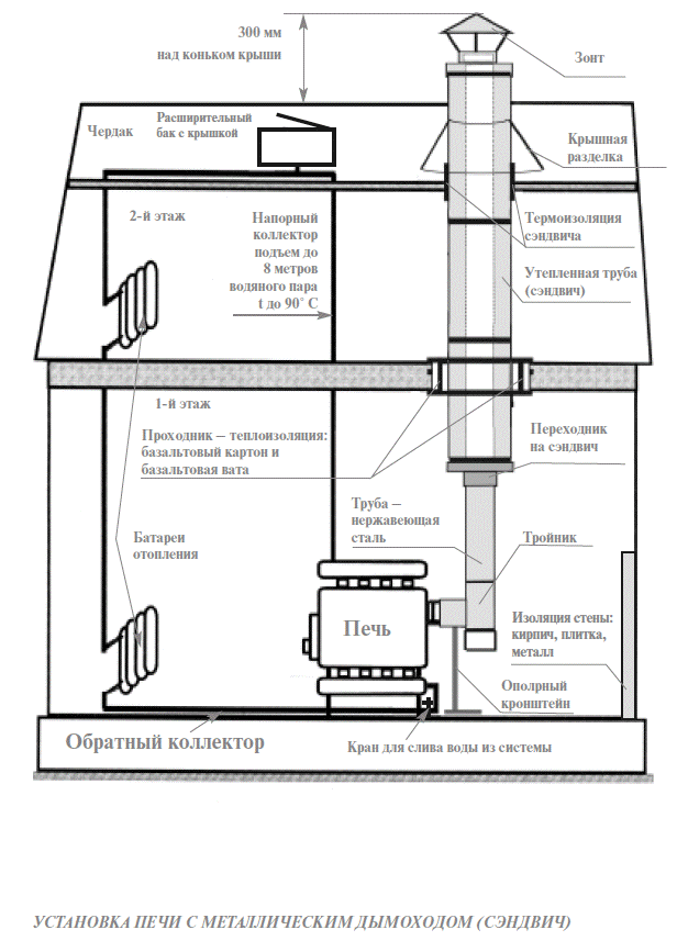Размеры разделок указанных дымовых труб в месте примыкания строительных конструкций и расстоянием между наружними поверхностями дымовых труб и стеной, перегородкой и другими конструкциями здания следует выполнять с учетом требований приложения к СНиП 41-01-2003 “Отопление, вентиляция, кондиционирование”. Расстояние от наружных поверхностей кирпичных или бетонных дымовых труб до стропил, обрешеток и других деталей кровли из горючих или трудногорючих материалов следует предусматривать в свету не менее 130 мм, от керамических труб без изоляции – 250 мм, а при наличии негорючей теплоизоляции с сопротивлением передачи 0,3 кв.м. х град.С/Вт – 130 мм. Металлический и асбоцементный дымоходы должны иметь теплоизоляцию из минеральной ваты, керамзита или подобных материалов толщиной не менее 80-120 мм - это предотвратит появление конденсата и обеспечит оптимальную работу печи.