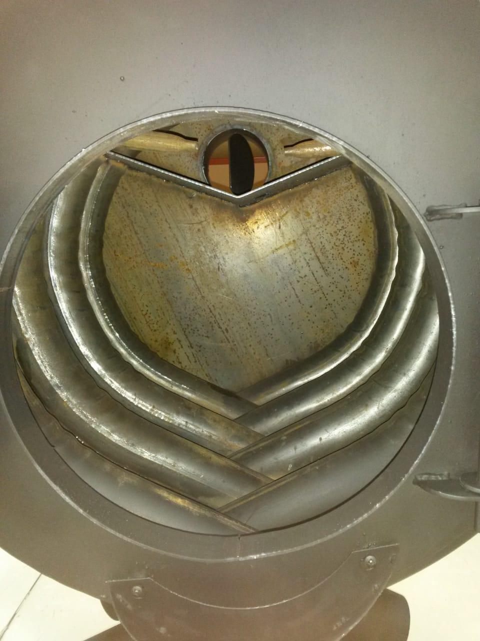 Топку печи образуют перекрещивающиеся трубы. Холодный воздух засасывается в трубы снизу, нагревается и выходит сверху уже горячим (120 С в режиме растопки или 50-60 С в режиме длительного горения). Таким образом воздух забирает тепло у стенки топки и нагревается сам. За счет того, что стенка топки постоянно обдувается воздухом и не успевает накалиться, печь Клондайк - Булерьян может работать, не прогарая, более 20 лет!