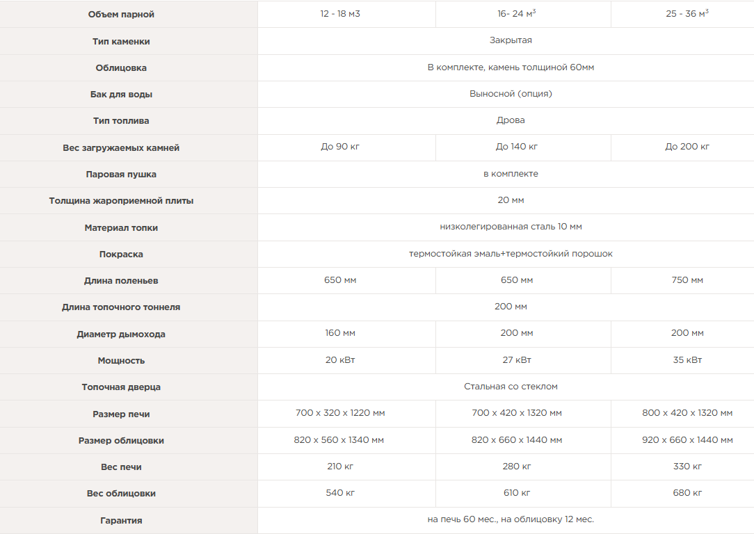 Максимальная температура камней за счет конструкции закрытой каменки печей (температура нижней части камней до 660°С), камни разогреваются с 5 сторон одновременно.