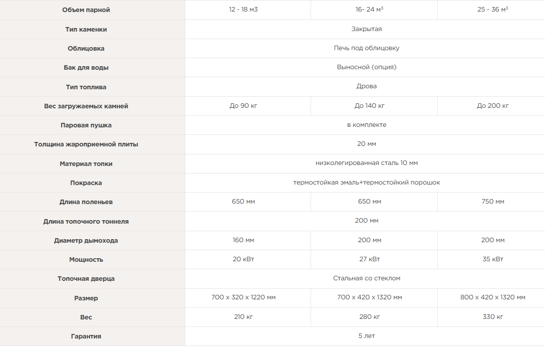 Максимальная температура камней за счет конструкции закрытой каменки печей (температура нижней части камней до 660°С), камни разогреваются с 5 сторон одновременно.