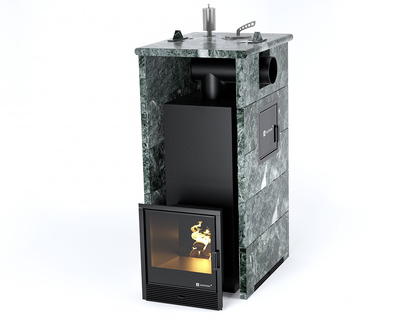 - Печь Геленджик М2 в трехстороннем кожухе с открытым верхом с боковым подключением - Вид топлива - Дрова, Марка стали - AISI 430, Варианты кожуха - Талькохлорит, Исполнение дверки - С тыла, Защита топки - Защ. экраны, Боковое подключение дымохода - Справа