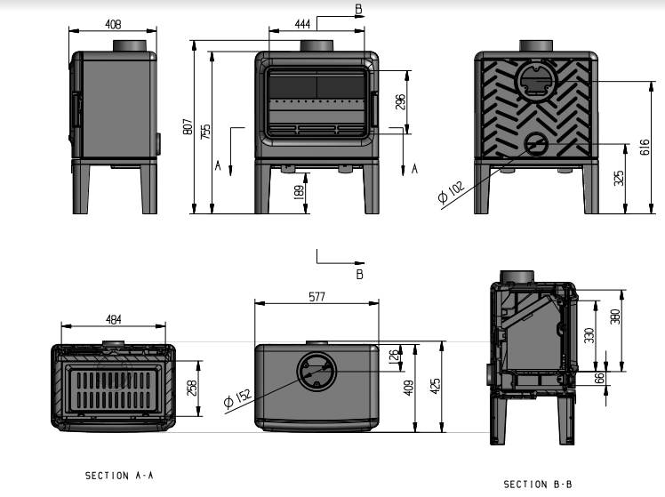 | Диаметр дымохода | 150 мм |