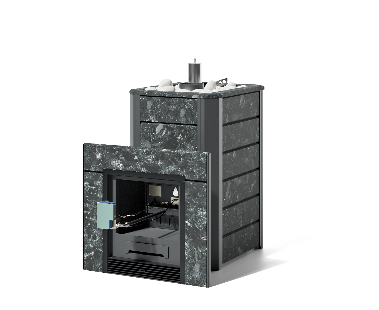 - Печь Ялта 25/2024 в облицовке из камня - Марка стали - AISI 321, Варианты кожуха - Талькохлорит, Вид топлива - Подготовка под ГГУ