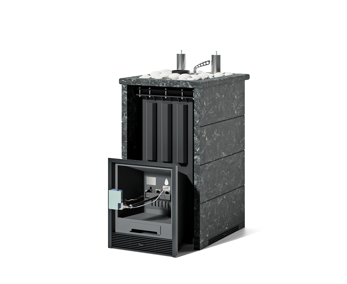 - Сочи К в трехстороннем кожухе - Варианты кожуха - Талькохлорит, Вид топлива - Газ, дрова Комплектация с ГГУ-40 электро, Марка стали - AISI 321